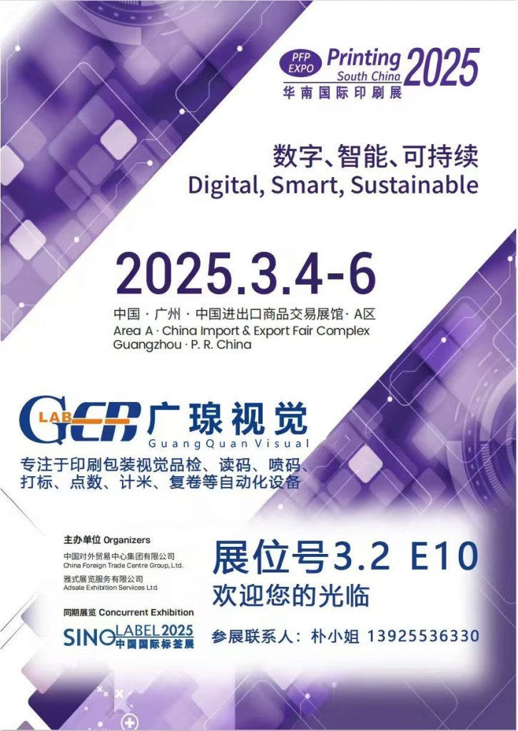 2025年3月4日至6日,廣瑔視覺(jué)將攜前沿技術(shù)與創(chuàng )新解決方案,正式亮相2025年華南國際印刷展(Printing 2025)。本屆展會(huì )以數字、智能、可持續”為核心主題,匯聚全球印刷包裝行業(yè)頂尖企業(yè),展示智能化、綠色化轉型成果。廣瑔視覺(jué)展位位于中國進(jìn)出口商品交易展館A區3.2 E10,誠邀行業(yè)伙伴共探技術(shù)革新與可持續發(fā)展新機遇。